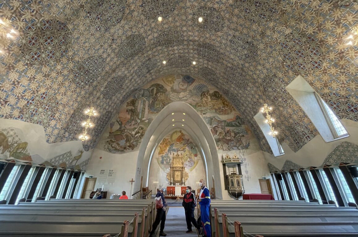 Innvendig er betongveggene pusset og malt og rikt dekorert. Kunstmaleren Alf Rolfsen har stått for både fargevalg og freskomalerier på vegger og i taket. Maleriene rundt korbuen på skipets østvegg viser sol og måne, Helligåndsduen, den paradisiske tilværelse, syndefallet, utdrivelsen fra Paradis, brodermordet og mennesket i arbeid. Korets østvegg har bilder av den tronende Kristus og evangelistene. I himlingen er det malt stjerner og kors, og en hjortefrise pryder nedre del av nordveggen.