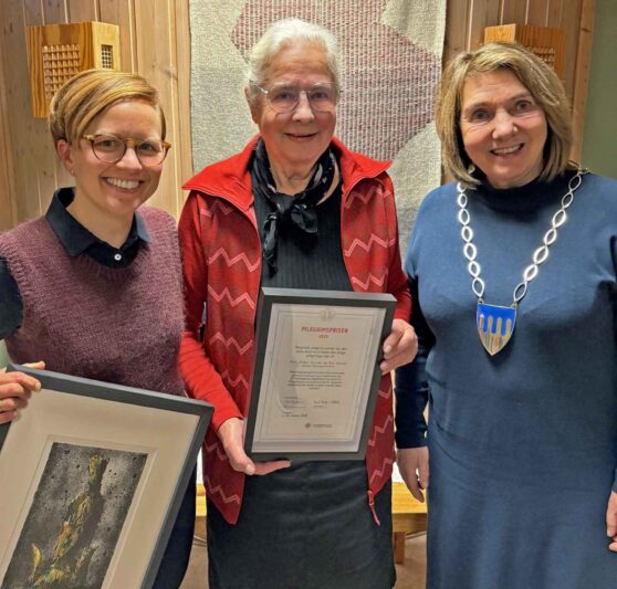 Pilegrimsprisen 2025 gikk til til Rutt og Ola Skauge. Rutt Olden Skauge fikk utdelt prisen av leder for Nasjonalt pilegrimssenger Guro Vistad (t.v.), her sammen med ordfører i Skaun, Gunn Iversen Stokke (t.h.).
