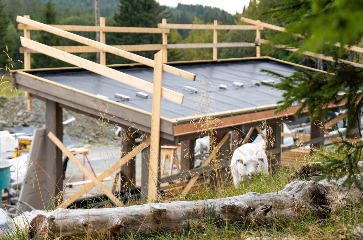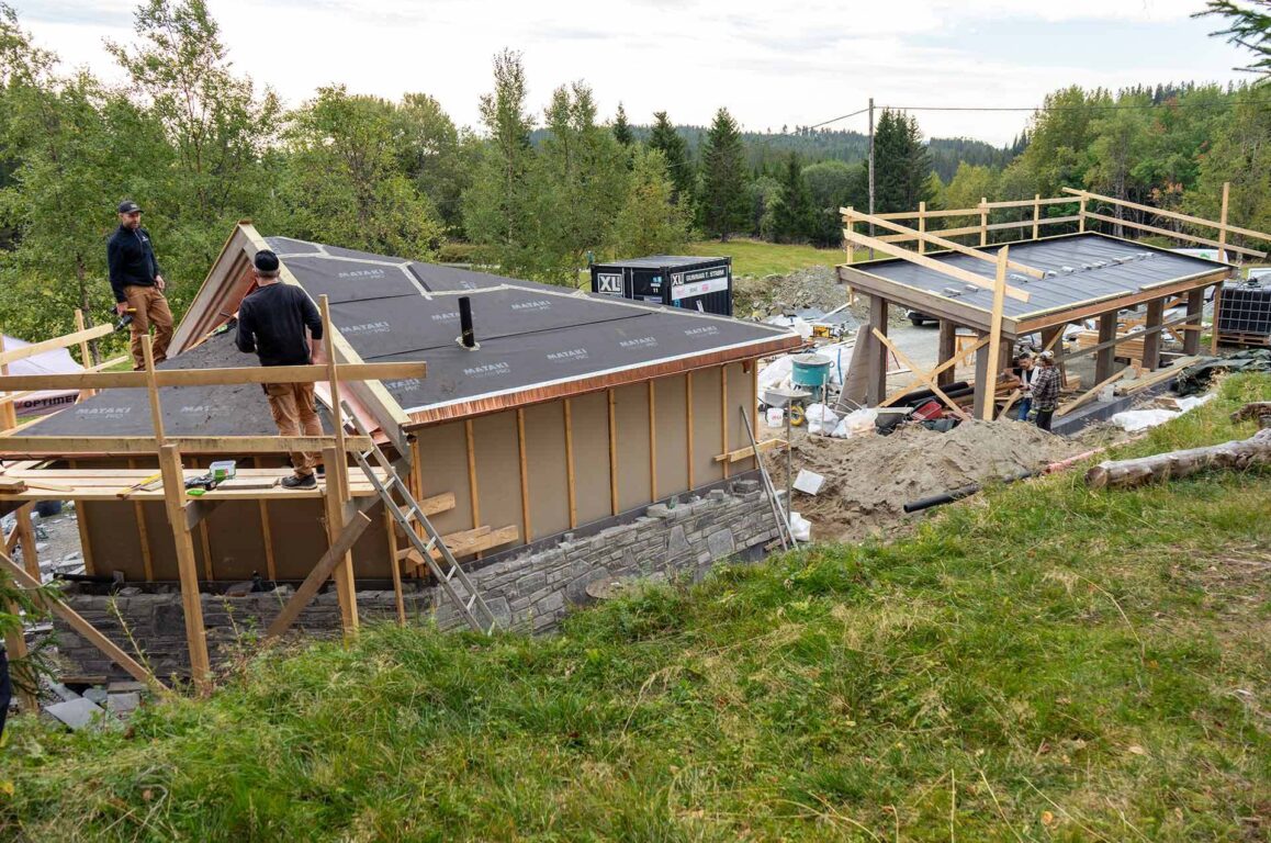 Både bua og gapahuken får til slutt lagt torvtak, og tilrettelegges med elektrisitet for lading.